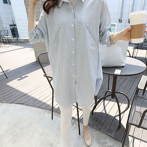 uni.K?正韓 休閒藍白直條紋假口袋長版襯衫(S-L)的產品介紹在下面,